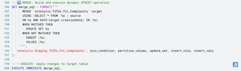 The built-in updatePartitionFilter (eg: partitionColumn >= xPeriod) helped reduce merge costs, but it wasn’t flexible enough for our data changes. Our template dynamically identifies all updated partitions from the staging table and limits the merge to those areas only. This gives us fully refreshed data without manual runs, without external scripts, and without wasteful costs.